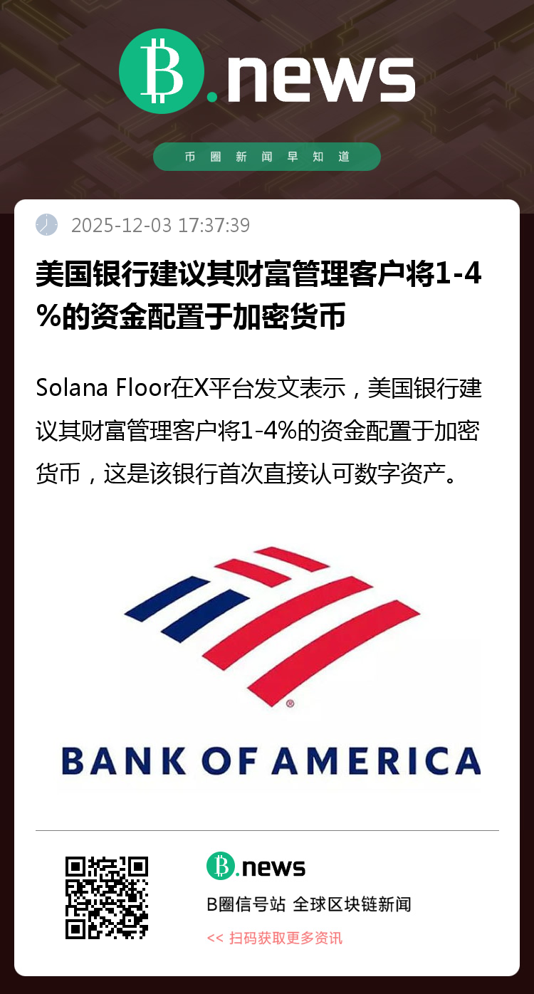 Solana Floor在X平台发文表示,美国银行建议其财富管理客户将1-4%的资金配置于加密货币,这是该银行首次直接认可数字资产。