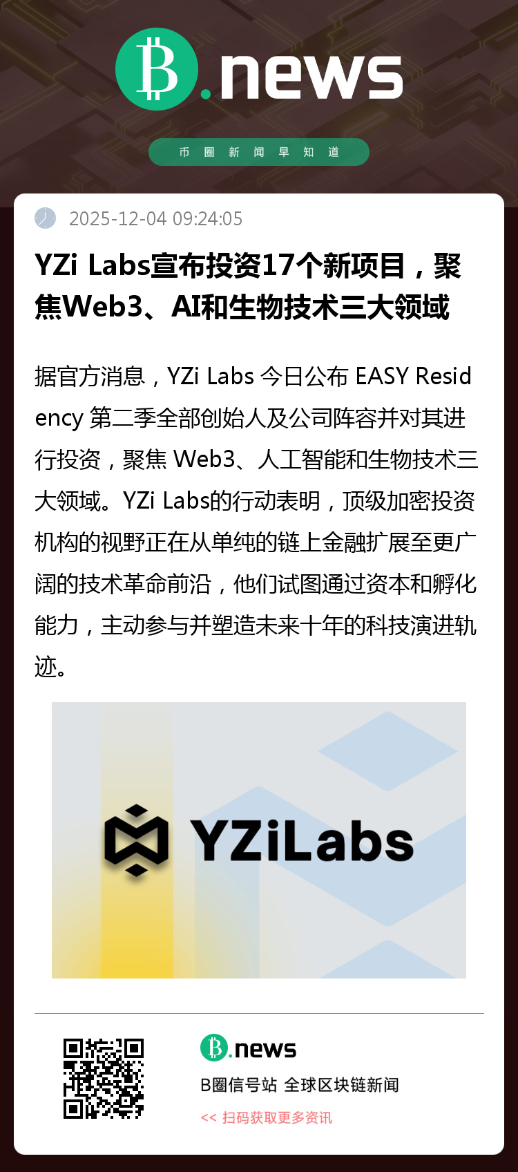 通过本轮投资与孵化支持,YZi Labs 正将其资源与生态网络深度对接至这些高潜力项目。此次阵容的发布,不仅反映了其对未来科技浪潮的精准研判,也体现了其通过资本与生态赋能,推动颠覆性创新从概念走向市场应用的坚定承诺。