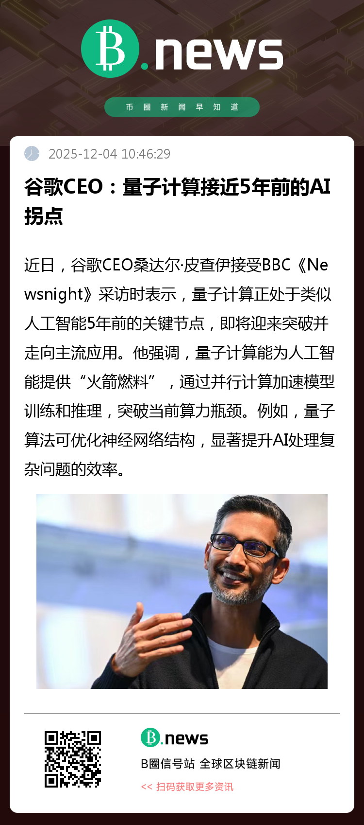 近日,谷歌CEO桑达尔·皮查伊接受BBC《Newsnight》采访时表示,量子计算正处于类似人工智能5年前的关键节点,即将迎来突破并走向主流应用。