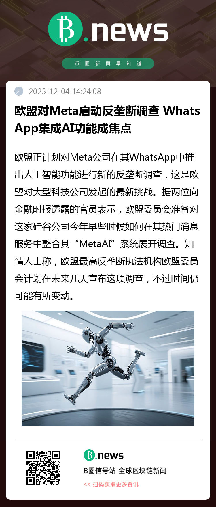 欧盟正计划对Meta公司在其WhatsApp中推出人工智能功能进行新的反垄断调查,这是欧盟对大型科技公司发起的最新挑战。据两位向金融时报透露的官员表示,欧盟委员会准备对这家硅谷公司今年早些时候如何在其热门消息服务中整合其“MetaAI”系统展开调查。知情人士称,欧盟最高反垄断执法机构欧盟委员会计划在未来几天宣布这项调查,不过时间仍可能有所变动。新的调查将属于传统反垄断法的范畴,而不是《数字市场法案》(DMA)——这项欧盟的里程碑式立法旨在解决大型在线平台的支配地位,但一直受到特朗普政府的特别抨击。意大利反垄断当局已在调查Meta,指控其利用其主导地位在未经用户同意的情况下将AI整合到WhatsApp中。