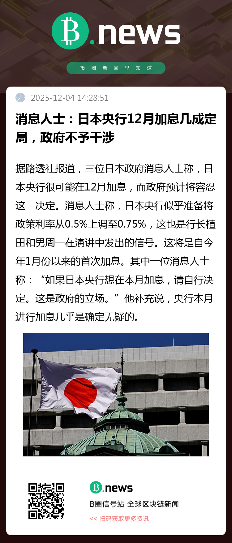 据路透社报道,三位日本政府消息人士称,日本央行很可能在12月加息,而政府预计将容忍这一决定。消息人士称,日本央行似乎准备将政策利率从0.5%上调至0.75%,这也是行长植田和男周一在演讲中发出的信号。这将是自今年1月份以来的首次加息。其中一位消息人士称:“如果日本央行想在本月加息,请自行决定。这是政府的立场。”他补充说,央行本月进行加息几乎是确定无疑的。植田周一表示,日本央行将考虑本月加息的“利弊”,预示着在12月18日至19日的会议上加息的可能性很大。这些言论导致市场对12月加息的定价约为80%的可能性,尽管一些市场参与者关注鸽派首相高市早苗的政府可能作何反应。市场的关注点可能会转向央行关于其最终会将利率提高到何种程度的措辞,而植田目前对这一话题仍然模棱两可。