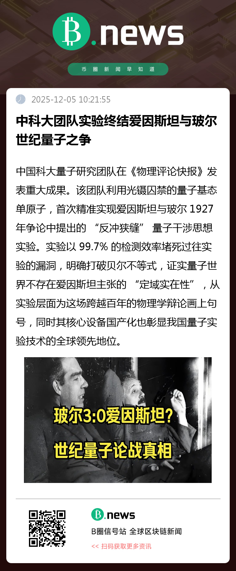 中国科大量子研究团队在《物理评论快报》发表重大成果。该团队利用光镊囚禁的量子基态单原子,首次精准实现爱因斯坦与玻尔 1927 年争论中提出的 “反冲狭缝” 量子干涉思想实验。实验以 99.7% 的检测效率堵死过往实验的漏洞,明确打破贝尔不等式,证实量子世界不存在爱因斯坦主张的 “定域实在性”,从实验层面为这场跨越百年的物理学辩论画上句号,同时其核心设备国产化也彰显我国量子实验技术的全球领先地位。