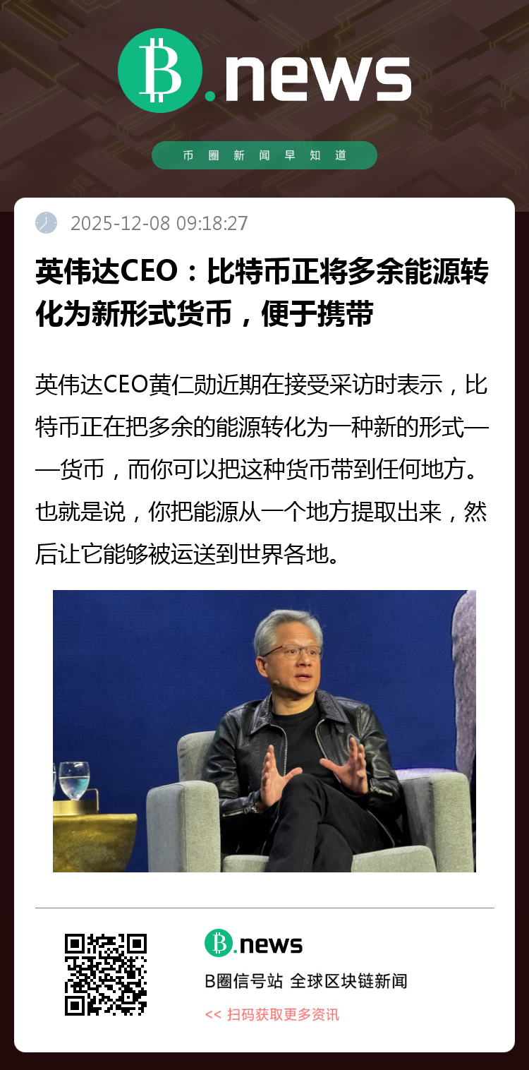 英伟达CEO黄仁勋近日在接受访谈时,对比特币的价值提出了一个富有想象力的比喻。他指出,比特币实质上是一种将剩余能源转化为新型可携带资产的方式——即一种全球通用的数字货币。