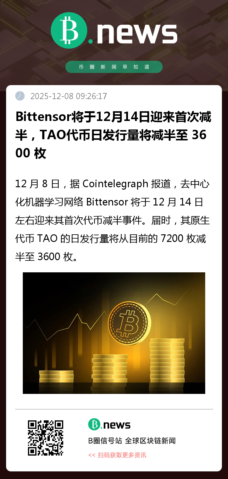 12 月 8 日,据 Cointelegraph 报道,去中心化机器学习网络 Bittensor 将于 12 月 14 日左右迎来其首次代币减半事件。届时,其原生代币 TAO 的日发行量将从目前的 7200 枚减半至 3600 枚。