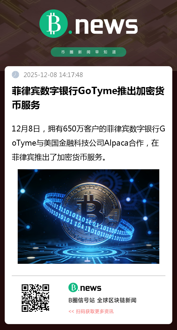 12月8日,拥有650万客户的菲律宾数字银行GoTyme与美国金融科技公司Alpaca合作,在菲律宾推出了加密货币服务。 现在,用户可以通过GoTyme的银行应用程序购买和存储共计11种加密资产,包括比特币、以太坊、SOL、DOT以及其他众多山寨币,这些资产可以通过菲律宾比索自动兑换成美元。