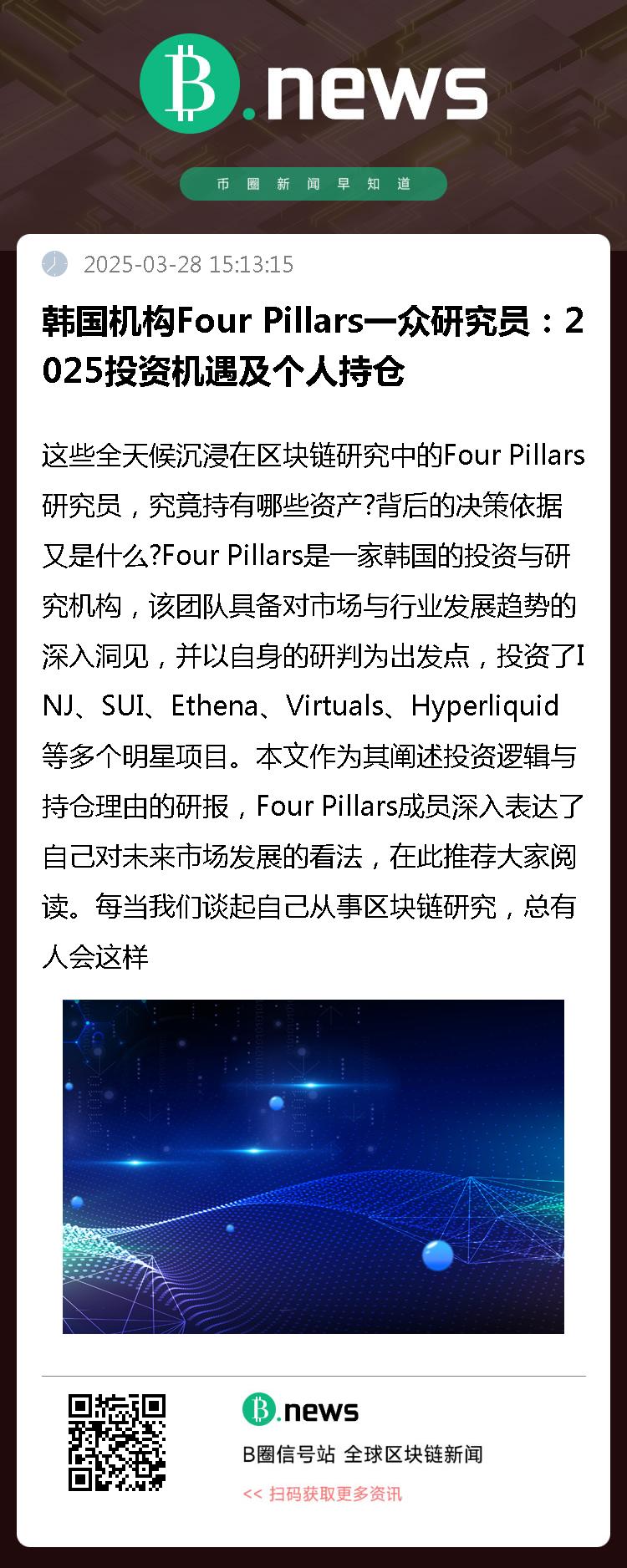 Four Pillars是一家韩国的投资与研究机构,该团队具备对市场与行业发展趋势的深入洞见,并以自身的研判为出发点,投资了INJ、SUI、Ethena、Virtuals、Hyperliquid等多个明星项目。本文作为其阐述投资逻辑与持仓理由的研报,Four Pillars成员深入表达了自己对未来市场发展的看法,在此推荐大家阅读。
