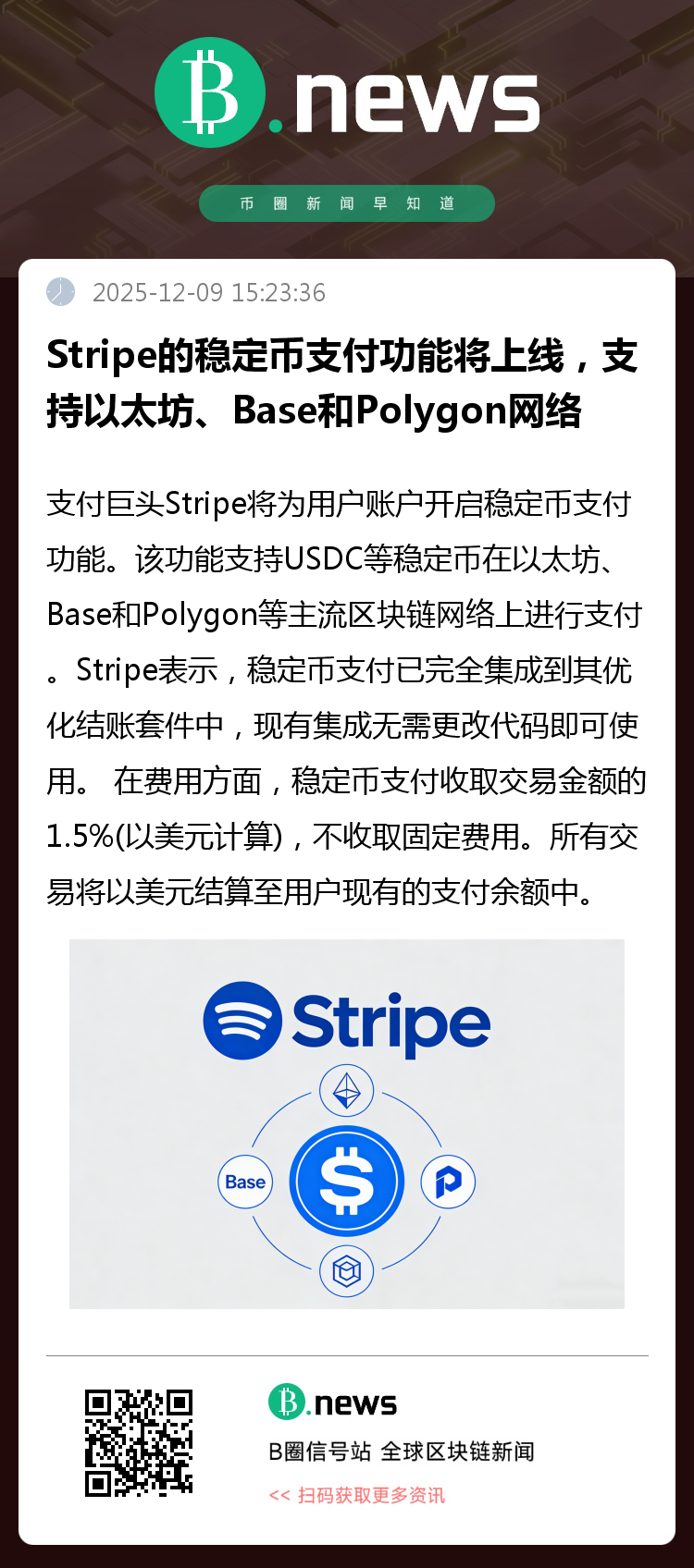 支付巨头Stripe将为用户账户开启稳定币支付功能。该功能支持USDC等稳定币在以太坊、Base和Polygon等主流区块链网络上进行支付。Stripe表示,稳定币支付已完全集成到其优化结账套件中,现有集成无需更改代码即可使用。 在费用方面,稳定币支付收取交易金额的1.5%(以美元计算),不收取固定费用。所有交易将以美元结算至用户现有的支付余额中。