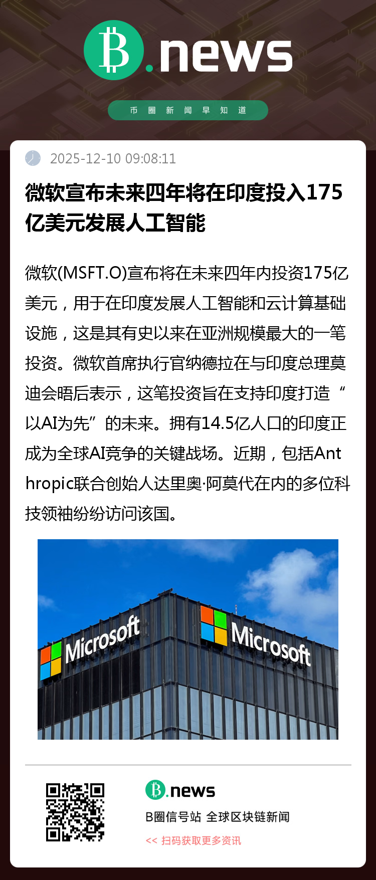 此次投资计划在微软首席执行官萨蒂亚·纳德拉与印度总理纳伦德拉·莫迪会晤后正式公布。纳德拉强调,该投资旨在全力赋能印度构建一个“以人工智能为先”的未来,通过强化云服务与AI能力,助力当地企业、公共部门及创新生态实现跨越式发展。