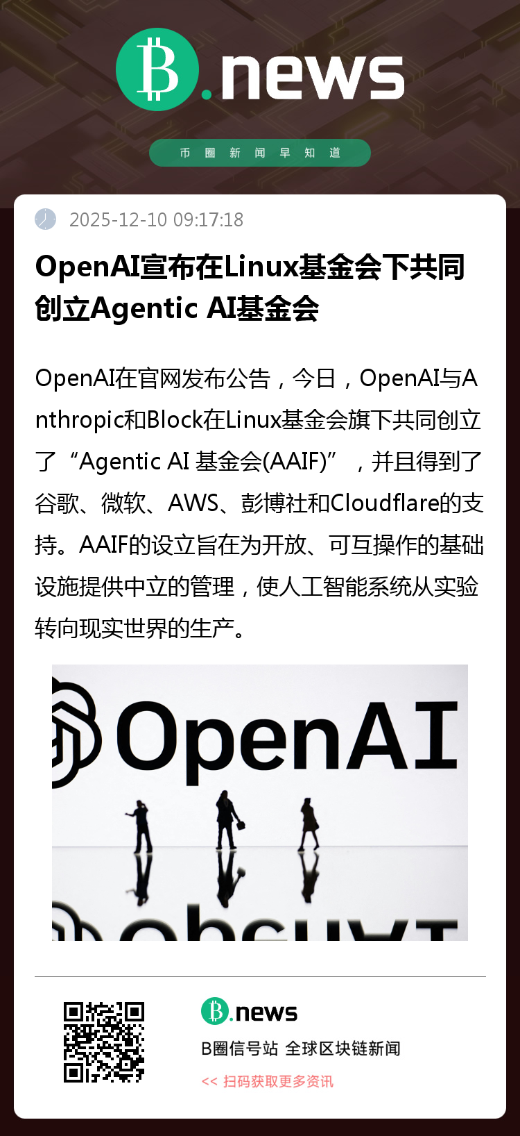 OpenAI于官方网站发布重要公告,宣布联合Anthropic与Block,在Linux基金会框架下共同创立“Agentic AI 基金会(AAIF)”。该倡议获得了谷歌、微软、AWS、彭博社及Cloudflare等科技与行业领导者的广泛支持。