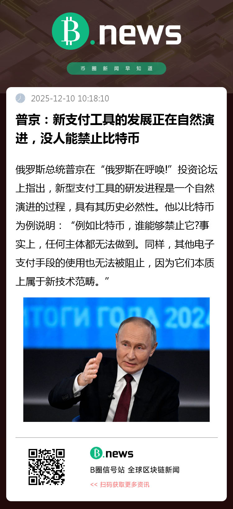 俄罗斯总统普京在近日举行的“俄罗斯在呼唤!”投资论坛上发表讲话时指出,新型支付工具的研发与应用正在全球范围内按自身逻辑稳步推进,这是一个不可逆转的进程。他以比特币为例强调:“例如比特币,谁能真正禁止它?事实上,没有人能做到。