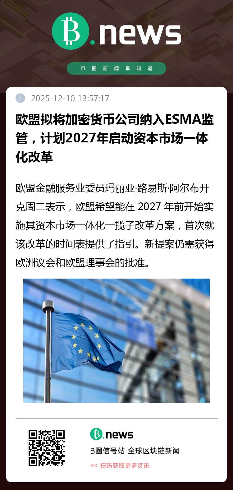 欧盟金融服务业委员玛丽亚·路易斯·阿尔布开克周二表示,欧盟希望能在 2027 年前开始实施其资本市场一体化一揽子改革方案,首次就该改革的时间表提供了指引。新提案仍需获得欧洲议会和欧盟理事会的批准,而部分成员国对此持强烈反对态度。集中监管权力将使重要的清算所、中央证券存管机构和交易平台纳入 ESMA 的管辖范围,加密货币公司也将受 ESMA 监管。