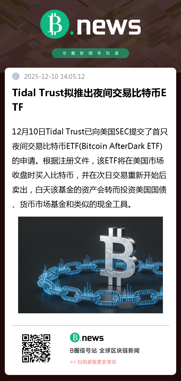 12月10日Tidal Trust已向美国SEC提交了首只夜间交易比特币ETF(Bitcoin AfterDark ETF)的申请。根据注册文件,该ETF将在美国市场收盘时买入比特币,并在次日交易重新开始后卖出,白天该基金的资产会转而投资美国国债、货币市场基金和类似的现金工具。