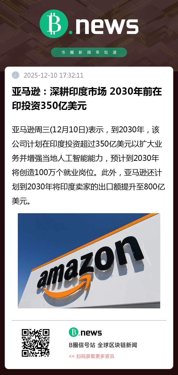 亚马逊周三(12月10日)表示,到2030年,该公司计划在印度投资超过350亿美元以扩大业务并增强当地人工智能能力,预计到2030年将创造100万个就业岗位。此外,亚马逊还计划到2030年将印度卖家的出口额提升至800亿美元。