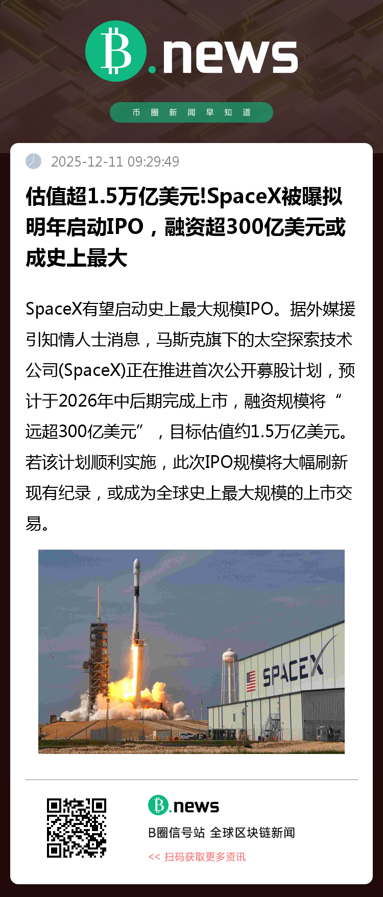 SpaceX有望启动史上最大规模IPO。据外媒援引知情人士消息,埃隆·马斯克旗下的太空探索技术公司(SpaceX)正在推进首次公开募股计划,预计于2026年中后期完成上市,融资规模将“远超300亿美元”,目标估值约1.5万亿美元。