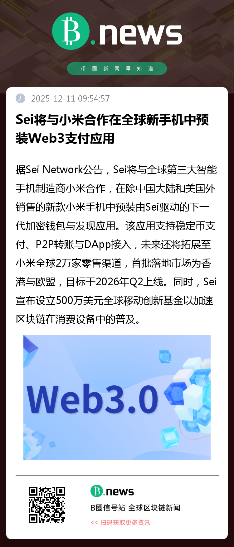 12月10日,区块链 Layer 1 网络 Sei Network 正式宣布,将与全球第三大智能手机制造商小米达成战略合作。根据公告,双方将在除中国大陆和美国以外市场销售的新款小米手机上,预装由 Sei 提供技术支持的下一代加密钱包与去中心化应用(DApp)发现平台。该内置应用将支持稳定币支付、点对点转账及无缝接入各类去中心化应用,旨在为用户提供安全、便捷的移动端数字资产管理与区块链服务体验。