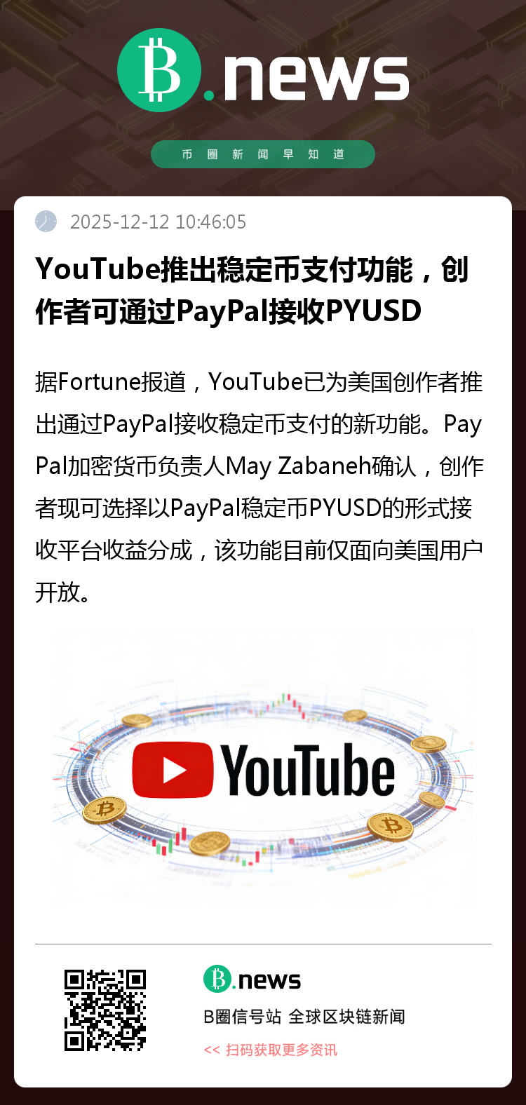 据Fortune报道,YouTube已为美国创作者推出通过PayPal接收稳定币支付的新功能。PayPal加密货币负责人May Zabaneh确认,创作者现可选择以PayPal稳定币PYUSD的形式接收平台收益分成,该功能目前仅面向美国用户开放。 YouTube此前已是PayPal支付服务的客户,使用其为大型企业提供零工和承包商支付的服务。今年第三季度初,PayPal为其支付接收方增加了以PYUSD接收款项的功能,随后 YouTube决定向创作者提供这一选项。 Zabaneh表示:"我们构建的优势在于YouTube无需直接接触加密货币,我们帮助消除了这种复杂性。"