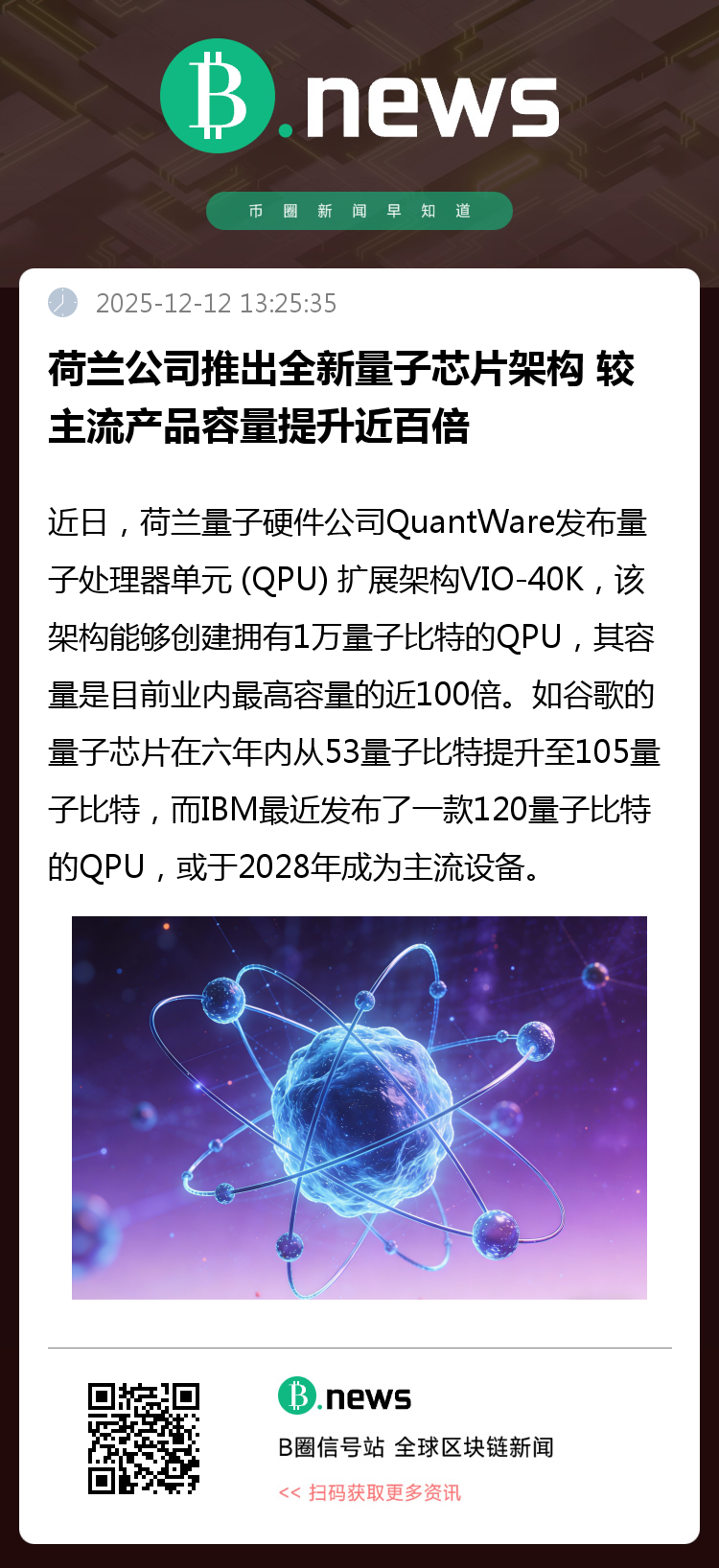 近日,荷兰量子硬件公司QuantWare发布量子处理器单元 (QPU) 扩展架构VIO-40K,该架构能够创建拥有1万量子比特的QPU,其容量是目前业内最高容量的近100倍。如谷歌的量子芯片在六年内从53量子比特提升至105量子比特,而IBM最近发布了一款120量子比特的QPU,或于2028年成为主流设备。