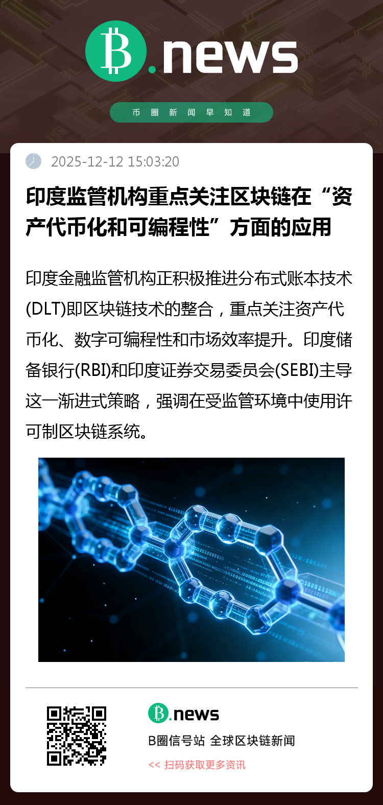 印度金融监管机构正积极推进分布式账本技术(DLT)即区块链技术的整合,重点关注资产代币化、数字可编程性和市场效率提升。印度储备银行(RBI)和印度证券交易委员会(SEBI)主导这一渐进式策略,强调在受监管环境中使用许可制区块链系统。