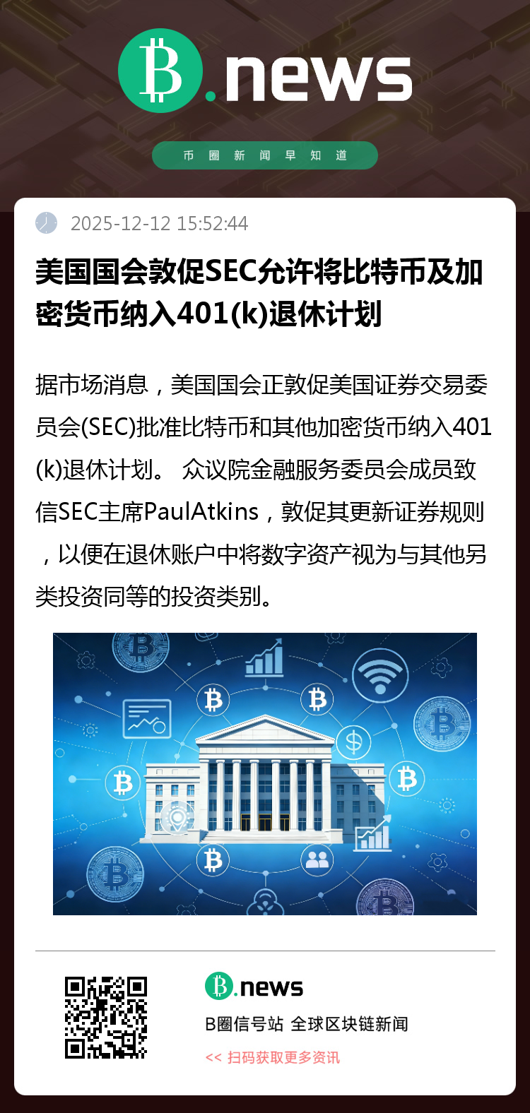 据市场消息,美国国会正敦促美国证券交易委员会(SEC)批准比特币和其他加密货币纳入401(k)退休计划。 众议院金融服务委员会成员致信SEC主席PaulAtkins,敦促其更新证券规则,以便在退休账户中将数字资产视为与其他另类投资同等的投资类别。议员们指出,为退休储蓄的美国人理应拥有更多投资选择,现行规则已过时且限制过多,阻碍了数百万民众接触新的资产类别。议员们还强调了重新定义“合格投资者”标准的必要性。目前,严格的投资者资格规定限制了部分私人及另类投资市场的参与。 这类计划通常仅面向富裕或高净值个人。而国会如今希望将规则扩大至拥有专业执照、具备相关工作经验或能通过能力考试的人群。议员们还表示,SEC应与负责监督退休计划受托人的劳工部协调,共同制定规则。他们认为,两大机构需找到一种安全且负责任的方式,将另类资产纳入401(k)计划的投资选项。