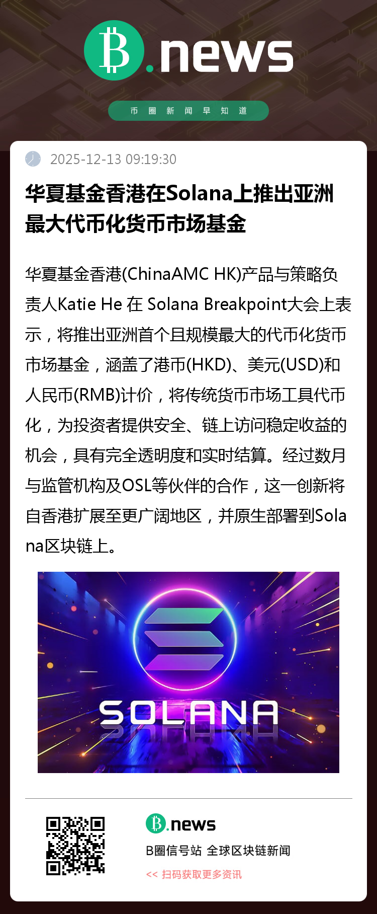 华夏基金香港(ChinaAMC HK)产品与策略负责人 Katie He 近日在 Solana Breakpoint 大会上发表重要演讲,宣布公司将推出亚洲首个、同时也是规模最大的代币化货币市场基金。