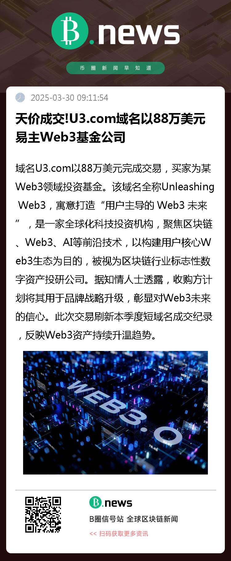 近日,域名U3.com以88万美元完成交易,买家为某Web3领域投资基金。该域名全称Unleashing Web3,寓意打造“用户主导的 Web3 未来”,是一家全球化科技投资机构,聚焦区块链、Web3、AI等前沿技术,以构建用户核心Web3生态为目的,被视为区块链行业标志性数字资产投研公司。