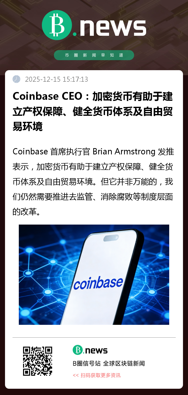 Coinbase CEO:加密货币有助于建立产权保障、健全货币体系及自由贸易环境