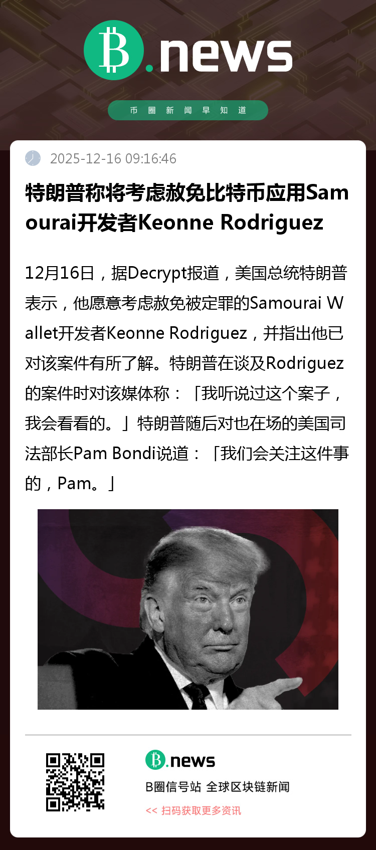 12月16日,据Decrypt报道,美国前总统唐纳德·特朗普在近期一次公开表态中透露,他愿意考虑赦免因开发 Samourai Wallet 而被定罪的开发者 Keonne Rodriguez。特朗普表示自己已对该案件有所关注,并回应称:“我听说过这个案子,我会看看的。” 他随后转向在场的美国前司法部长帕姆·邦迪补充道:“我们会关注这件事的,帕姆。”