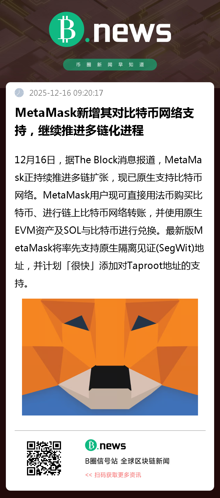 12月16日,据The Block报道,知名加密钱包MetaMask正在加速其多链生态布局,正式宣布原生集成比特币网络。此次更新标志着MetaMask从一个以以太坊为核心的钱包,向支持多链资产管理的综合性平台迈进关键一步。