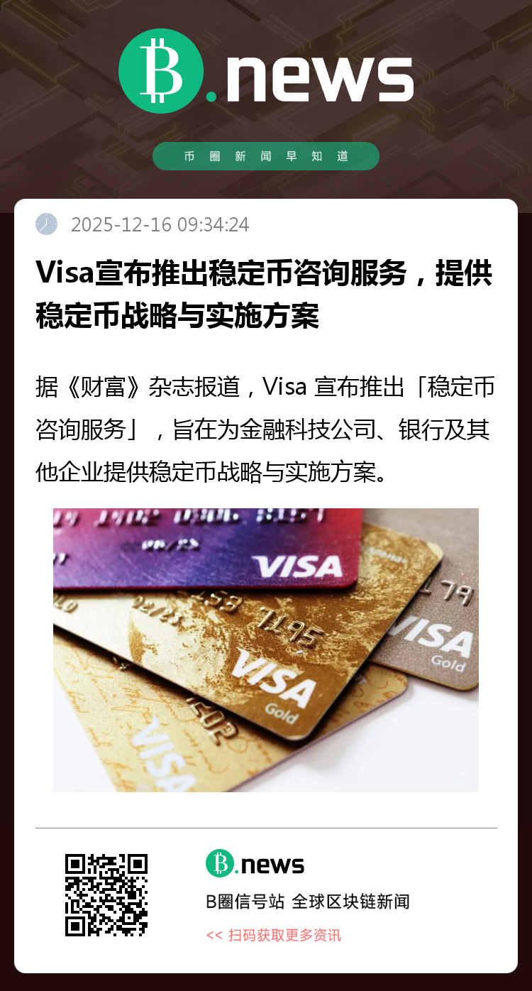 据《财富》杂志报道,Visa 宣布推出「稳定币咨询服务」,旨在为金融科技公司、银行及其他企业提供稳定币战略与实施方案。