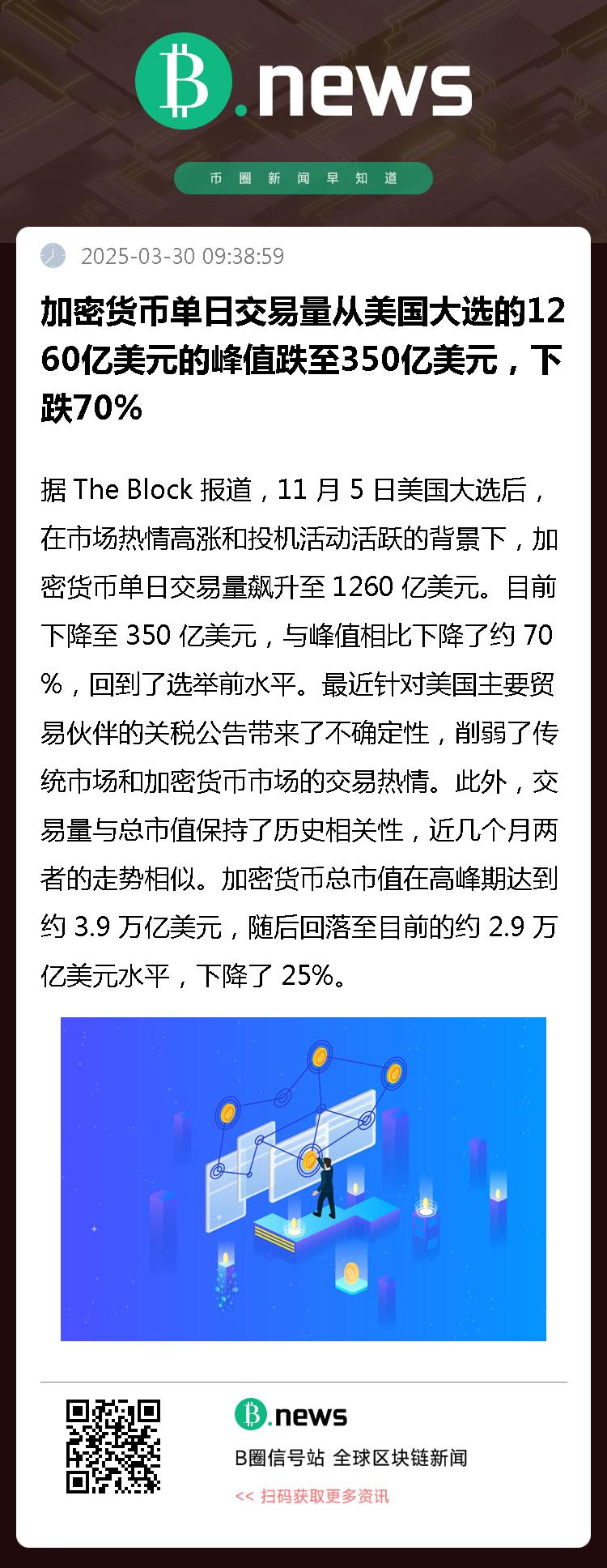 据 The Block 报道,11 月 5 日美国大选后,在市场热情高涨和投机活动活跃的背景下,加密货币单日交易量飙升至 1260 亿美元。目前下降至 350 亿美元,与峰值相比下降了约 70%,回到了选举前水平。最近针对美国主要贸易伙伴的关税公告带来了不确定性,削弱了传统市场和加密货币市场的交易热情。此外,交易量与总市值保持了历史相关性,近几个月两者的走势相似。加密货币总市值在高峰期达到约 3.9 万亿美元,随后回落至目前的约 2.9 万亿美元水平,下降了 25%。