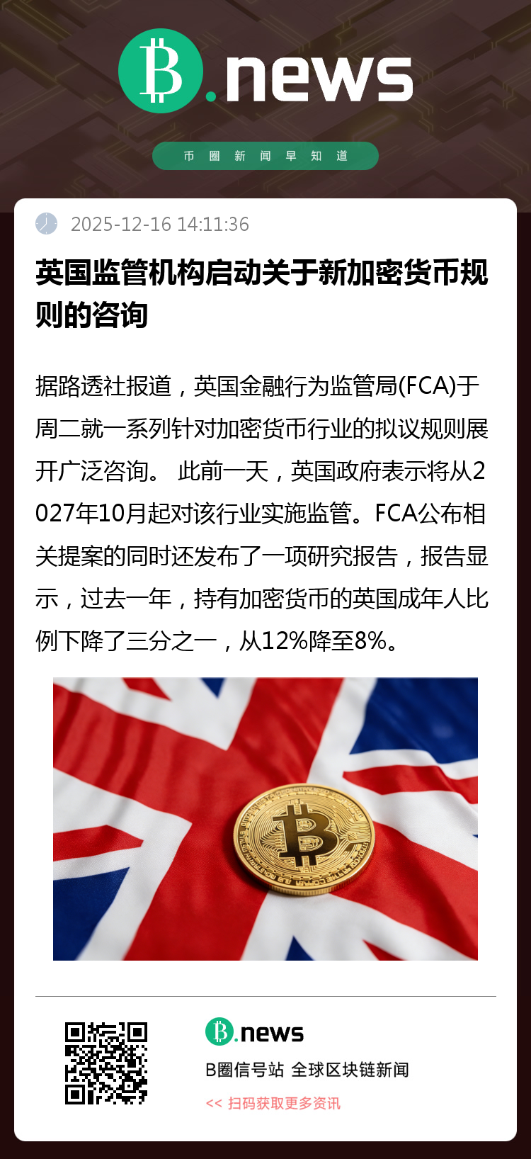 据路透社报道,英国金融行为监管局(FCA)于周二就一系列针对加密货币行业的拟议规则展开广泛咨询。 此前一天,英国政府表示将从2027年10月起对该行业实施监管。FCA公布相关提案的同时还发布了一项研究报告,报告显示,过去一年,持有加密货币的英国成年人比例下降了三分之一,从12%降至8%。 FCA周二表示,其规则将涵盖加密资产的上市、制止内幕交易和操纵行为的措施、加密货币交易平台标准以及经纪商规则。该机构还就审慎要求、使加密货币质押风险更明晰的监管规定、为加密货币借贷双方提供更完善的保护,以及加密公司管理风险的潜在金融保障措施等事项展开咨询。 FCA正就其提案征求意见,截止日期为2026年2月12日。该监管机构承诺将于明年年底前最终确定监管制度。(来源:路透社)