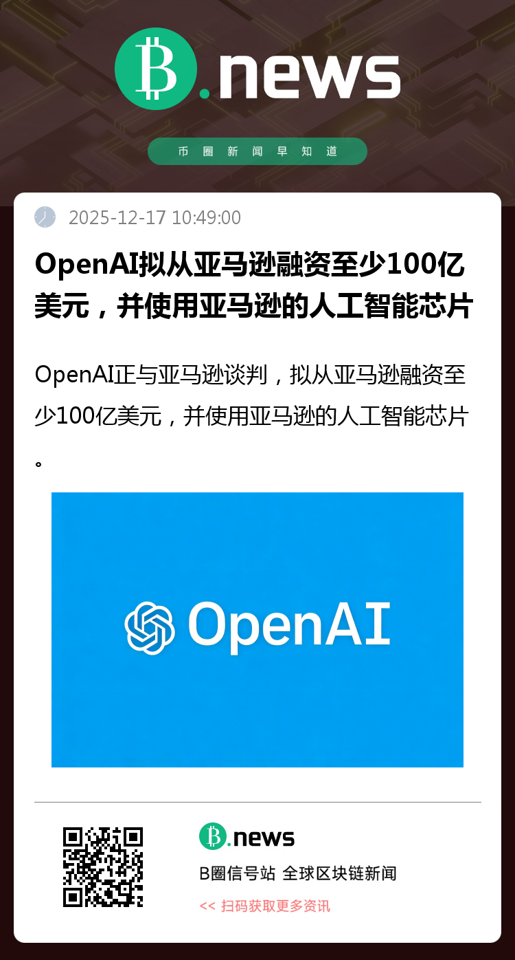 据The Information:OpenAI正与亚马逊谈判,拟从亚马逊融资至少100亿美元,并使用亚马逊的人工智能芯片。(来源:金十)