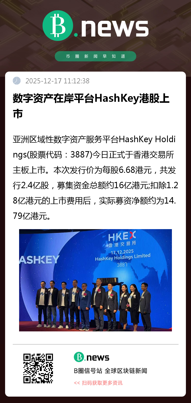 亚洲区域性数字资产服务平台HashKey Holdings(股票代码:3887)今日正式于香港交易所主板上市。本次发行价为每股6.68港元,共发行2.4亿股,募集资金总额约16亿港元;扣除1.28亿港元的上市费用后,实际募资净额约为14.79亿港元。