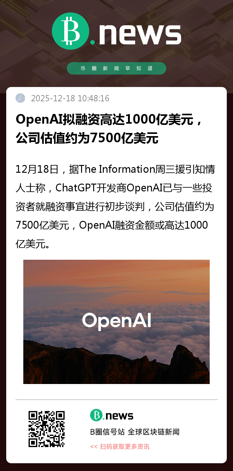 12月18日,据权威科技媒体The Information援引多位知情人士独家报道,全球人工智能领域的绝对龙头——OpenAI,已悄然启动新一轮史诗级融资的初步谈判。此次谈判的核心,是围绕该公司高达约7500亿美元的惊人估值展开,而拟募集的资金规模或将达到1000亿美元之巨。