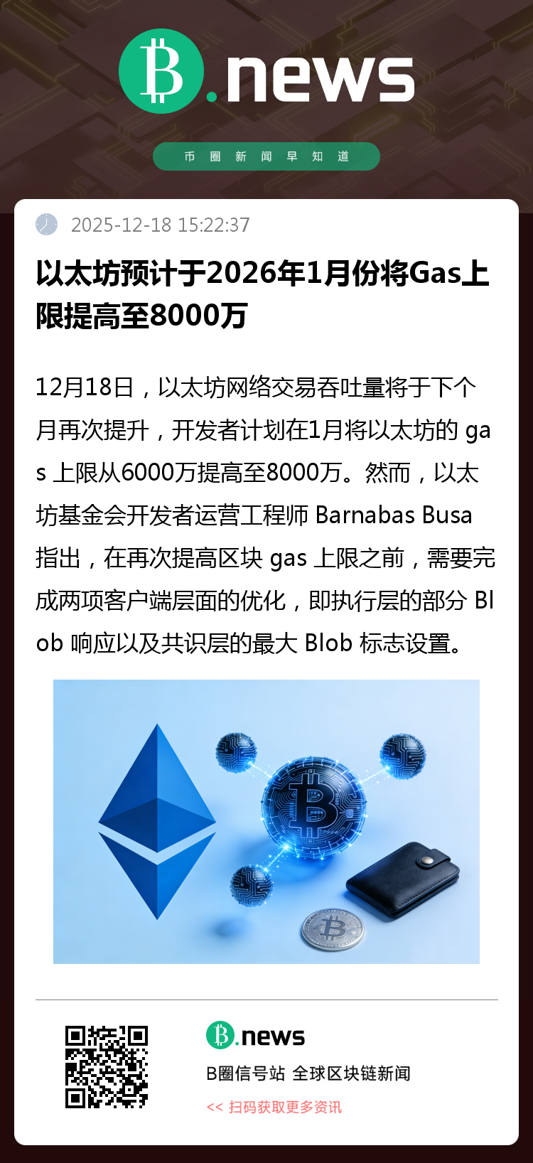 12月18日,以太坊网络交易吞吐量将于下个月再次提升,开发者计划在1月将以太坊的 gas 上限从6000万提高至8000万。然而,以太坊基金会开发者运营工程师 Barnabas Busa 指出,在再次提高区块 gas 上限之前,需要完成两项客户端层面的优化,即执行层的部分 Blob 响应以及共识层的最大 Blob 标志设置。全体以太坊核心开发者会议参与者将于1月5 日再次集会,确认在第二次 BPO 硬分叉后何时提高 gas 上限。第一次 BPO 硬分叉于12月 9日进行,将 blob 容量提高了66%;预计1月7日进行的第二次硬分叉将再提高 66%。以太坊开发者与研究社区成员已达成共识,目标是在2026年底前将网络的gas上限提高至1.8亿。(来源:Cointelegraph)
