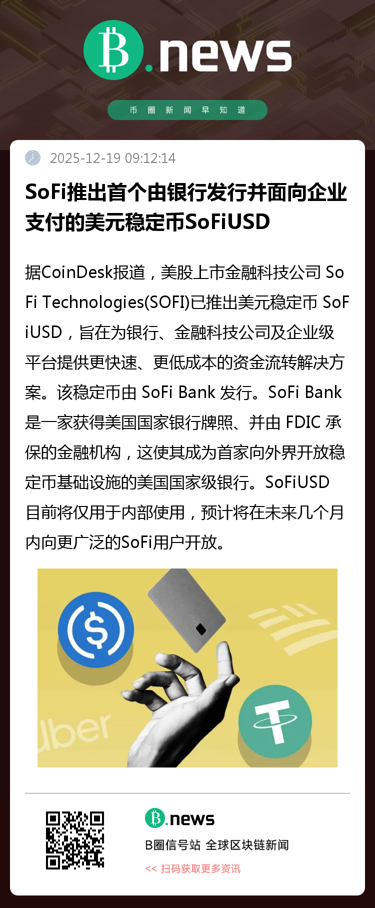 总体来看,SoFiUSD的推出不仅是SoFi自身业务矩阵的重要扩展,也反映出传统持牌金融机构正以更积极的姿态融入数字货币生态。在稳定币逐渐成为支付与结算重要工具的今天,由FDIC承保的银行发行完全储备型稳定币,或将为行业树立新的安全性与合规性标杆。(来源:BLOCKBEATS)