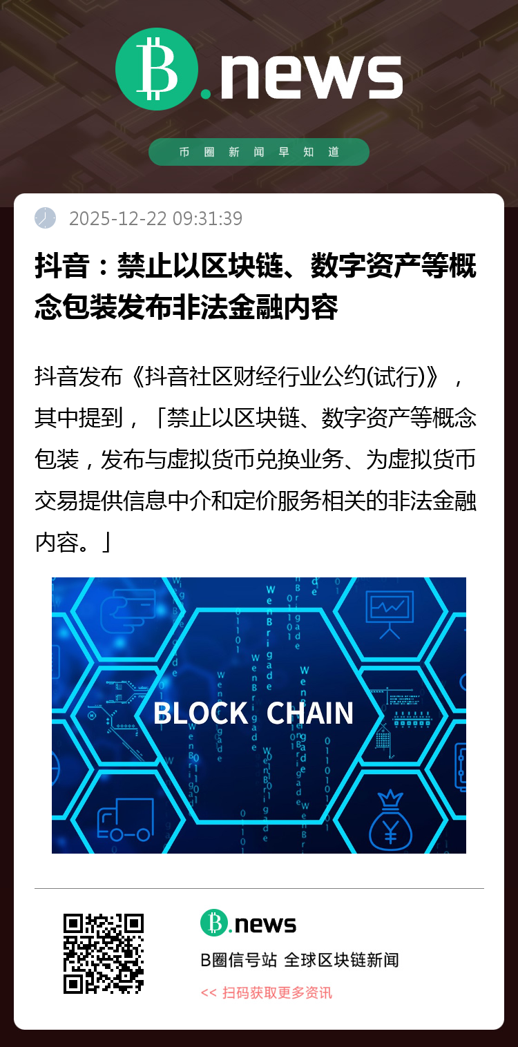 近日,抖音平台正式发布《抖音社区财经行业公约(试行)》,进一步明确和规范平台内财经相关内容传播秩序。其中特别强调,将严格禁止利用区块链、数字资产等新兴技术概念进行包装,变相发布涉及虚拟货币兑换业务、为虚拟货币交易提供信息中介及定价服务等类型的非法金融活动信息。