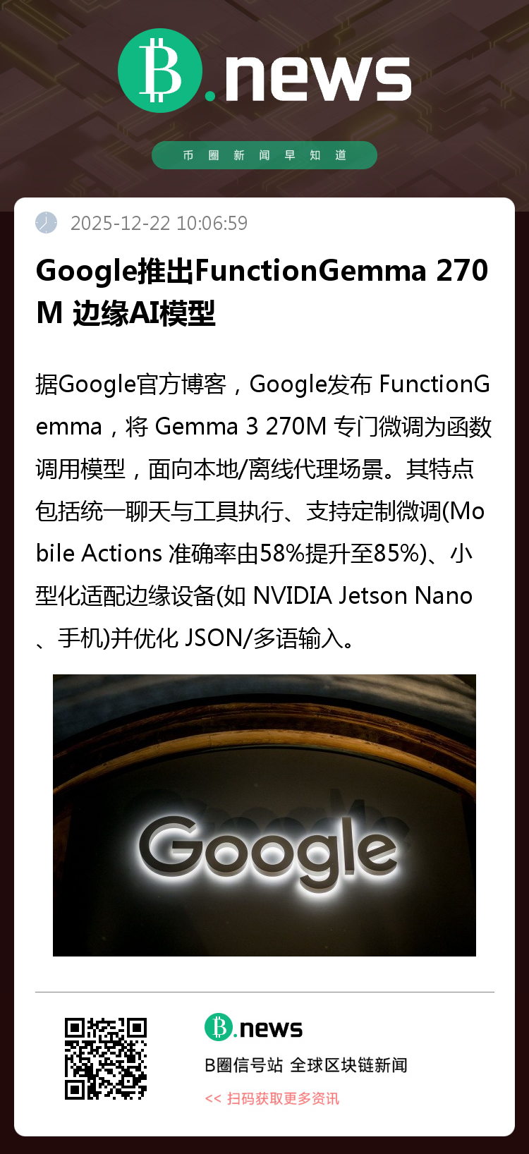据Google官方博客,Google发布 FunctionGemma,将 Gemma 3 270M 专门微调为函数调用模型,面向本地/离线代理场景。其特点包括统一聊天与工具执行、支持定制微调(Mobile Actions 准确率由58%提升至85%)、小型化适配边缘设备(如 NVIDIA Jetson Nano、手机)并优化 JSON/多语输入。官方提供 Hugging Face、Kaggle 下载及 Transformers、Unsloth、Keras、NeMo 微调与 LiteRT‑LM、vLLM、MLX、Llama.cpp、Ollama、Vertex AI、LM Studio 部署指引,并上线 Edge Gallery 多项演示与数据集/Colab。(来源:PANews)
