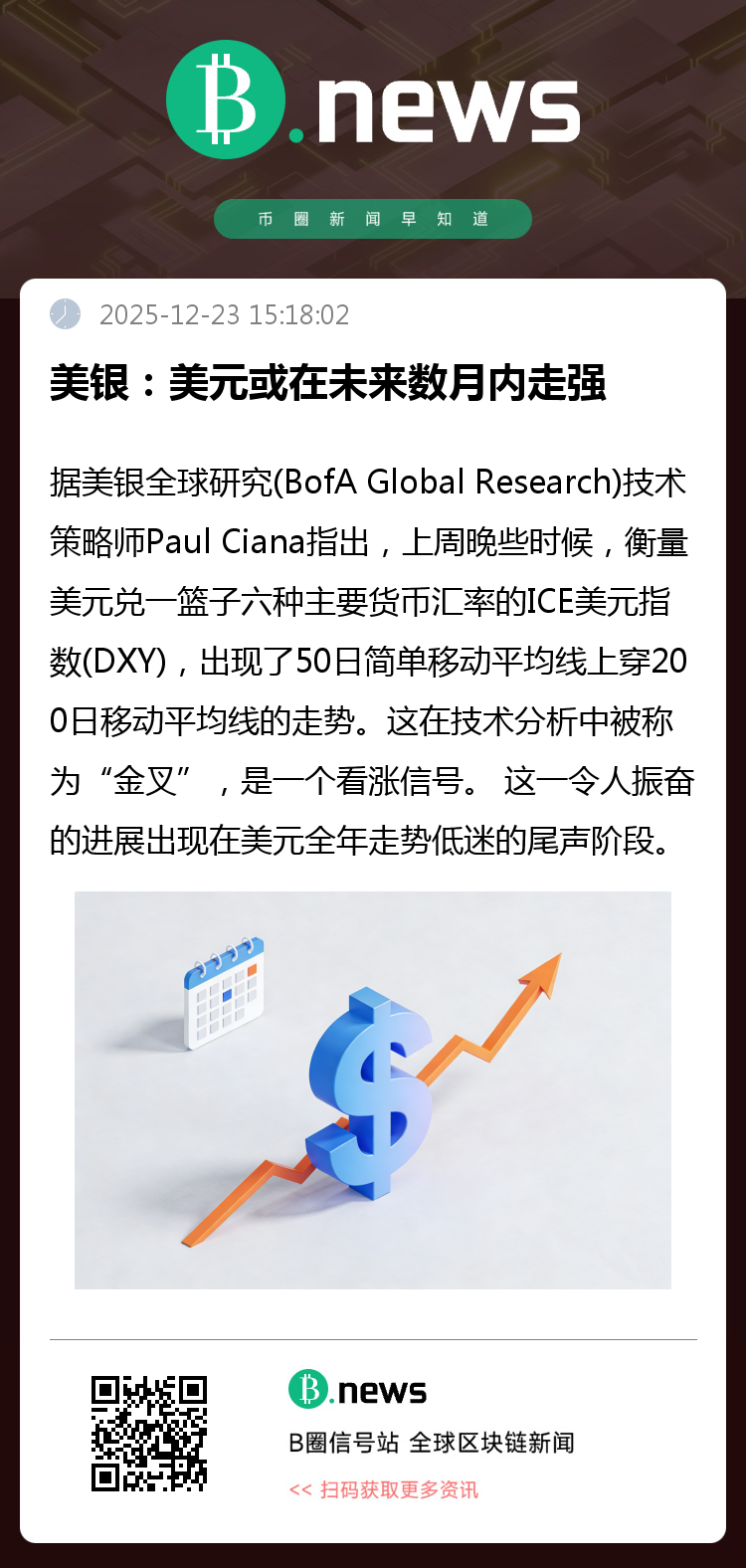 据美银全球研究(BofA Global Research)技术策略师Paul Ciana指出,上周晚些时候,衡量美元兑一篮子六种主要货币汇率的ICE美元指数(DXY),出现了50日简单移动平均线上穿200日移动平均线的走势。这在技术分析中被称为“金叉”,是一个看涨信号。 这一令人振奋的进展出现在美元全年走势低迷的尾声阶段。自2025年初以来,美元指数已累计下跌约9%。周一,该指数下跌0.3%,报98.30点,仅略高于年内的最低水平。 美银策略师Ciana指出,这是自1970年以来美元出现的第39次“金叉”信号。对于那些正在寻找美元反弹迹象的投资者而言,这一信号暗示美元可能在未来数月内走强。 Ciana在书面报告中表示:“总体而言,‘金叉’信号对美元一直意味着利好。”他指出,一旦出现“金叉”,美元往往会在随后的20至60个交易日内走高。
