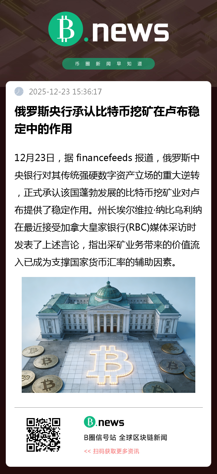 12月23日,据 financefeeds 报道,俄罗斯中央银行对其传统强硬数字资产立场的重大逆转,正式承认该国蓬勃发展的比特币挖矿业对卢布提供了稳定作用。州长埃尔维拉·纳比乌利纳在最近接受加拿大皇家银行(RBC)媒体采访时发表了上述言论,指出采矿业务带来的价值流入已成为支撑国家货币汇率的辅助因素。这一承认标志着这家长期主张全面禁止加密货币的机构的务实转向。虽然纳比乌利纳承认,由于该行业有相当一部分处于法律灰色地带,准确量化影响仍困难,她将采矿业视为一个有形的宏观经济变量。这一发展是在经历极端经济压力时期之后,国家寻求替代金融渠道以规避国际制裁并管理流动性。(来源:financefeeds)