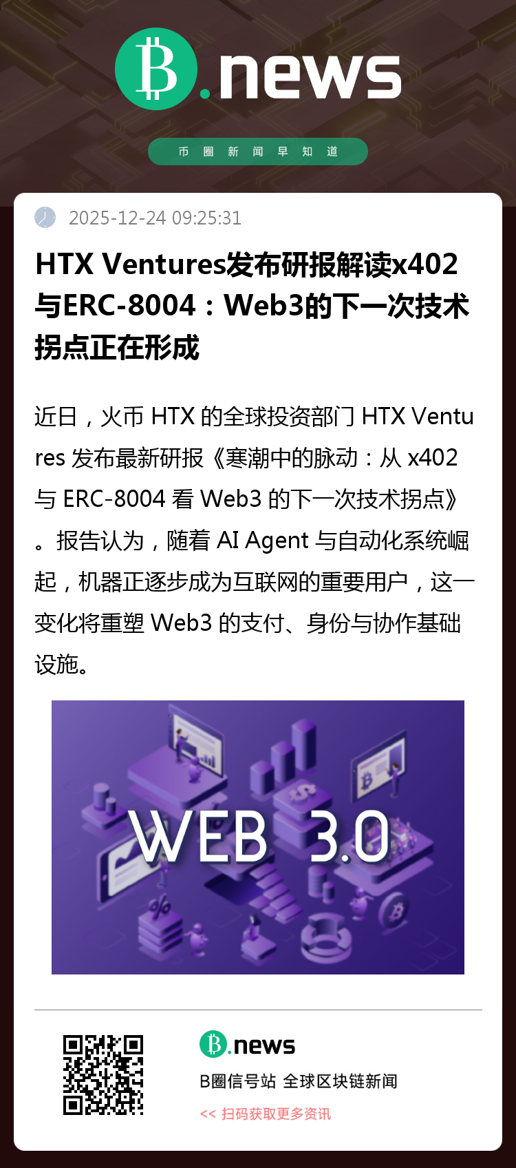 近日,火币 HTX 全球投资部门 HTX Ventures 发布题为《寒潮中的脉动:从 x402 与 ERC-8004 看 Web3 的下一次技术拐点》的深度研究报告。报告指出,随着 AI Agent 与自动化系统的快速发展,机器正在逐步成为互联网中不可忽视的“新型用户”,这一根本性转变将深刻重塑 Web3 在支付、身份验证与协同协作等方面的基础设施架构。