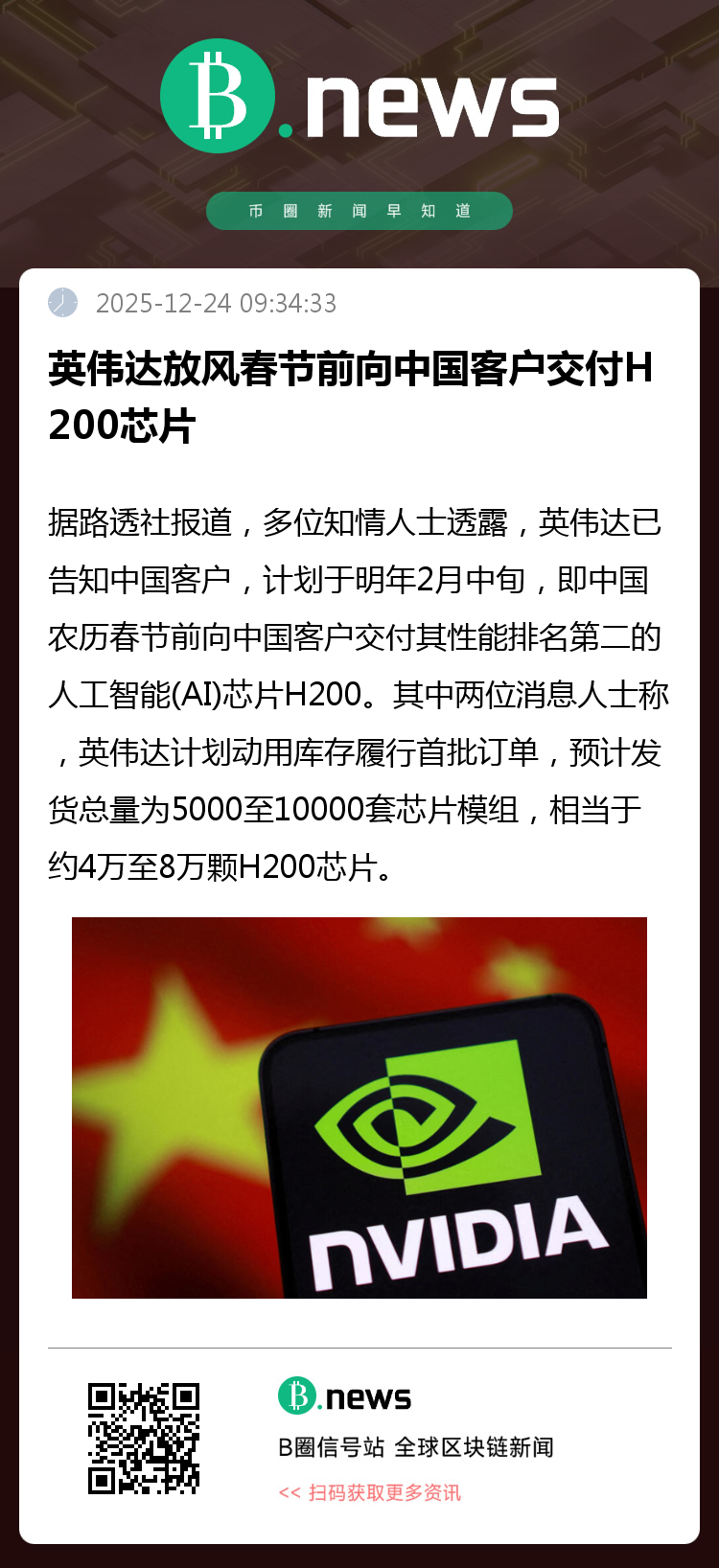 据路透社报道,多位知情人士透露,英伟达已向中国客户表示,计划于明年2月中旬、即农历春节前交付其性能排名第二的人工智能芯片H200。其中两位消息人士称,英伟达计划利用现有库存履行首批订单,预计发货总量为5000至10000套芯片模组,相当于约4万至8万颗H200芯片。