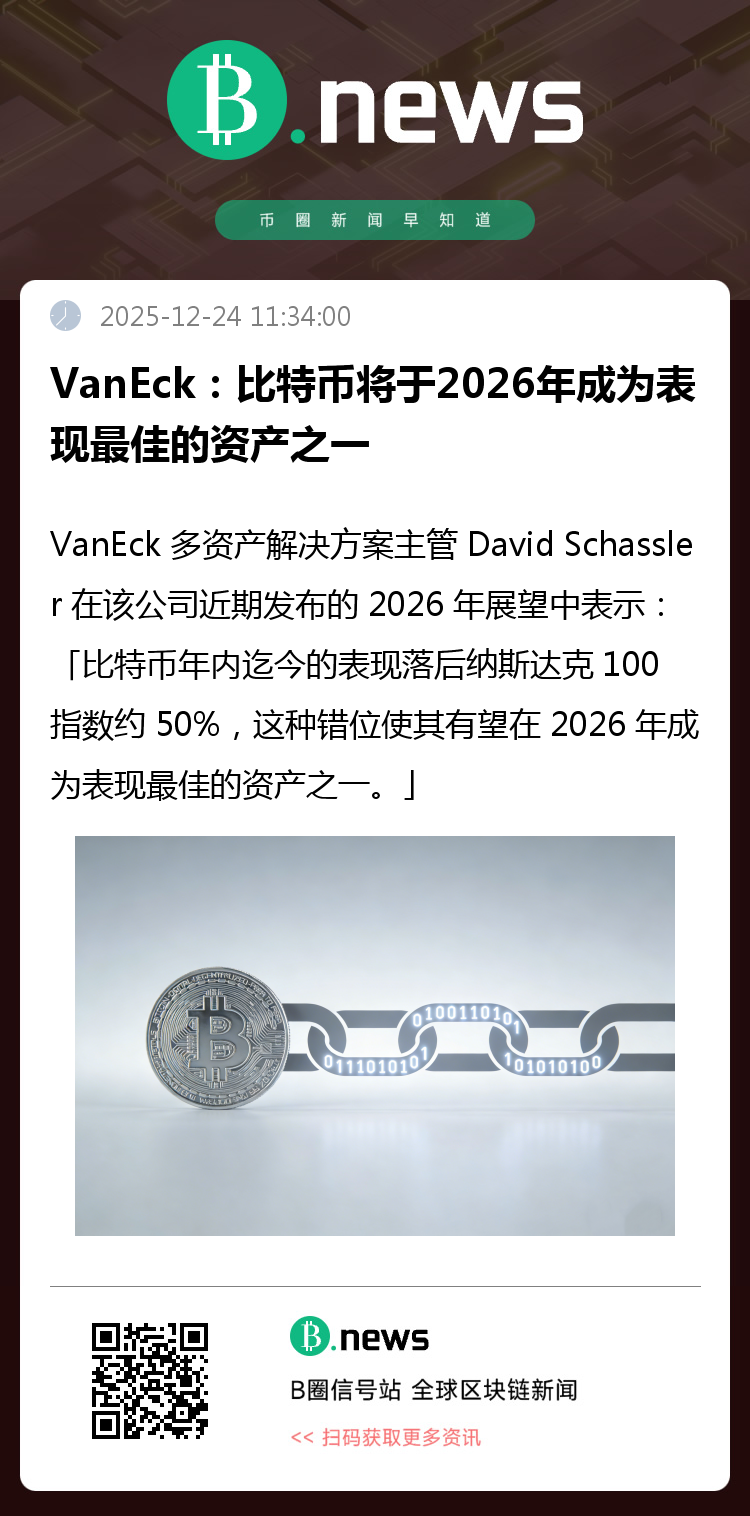 VanEck 多资产解决方案主管 David Schassler 在该公司近期发布的 2026 年展望中表示:「比特币年内迄今的表现落后纳斯达克 100 指数约 50%,这种错位使其有望在 2026 年成为表现最佳的资产之一。」