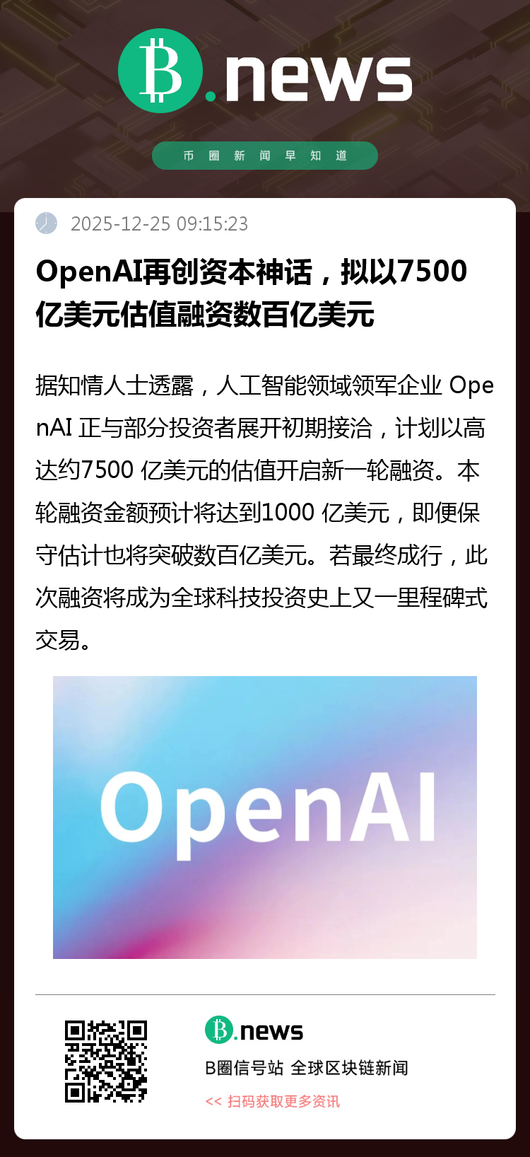 据知情人士透露,人工智能领域领军企业 OpenAI 正与部分投资者展开初期接洽,计划以高达约7500 亿美元的估值开启新一轮融资。本轮融资金额预计将达到1000 亿美元,即便保守估计也将突破数百亿美元。若最终成行,此次融资将成为全球科技投资史上又一里程碑式交易。
