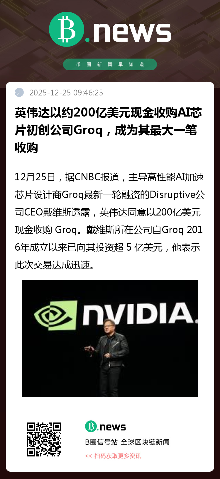 12月25日,据CNBC报道,高性能AI加速芯片设计公司Groq即将被英伟达以200亿美元现金收购,该消息由Groq长期投资方Disruptive公司的CEO戴维斯透露。自Groq于2016年成立以来,Disruptive已累计向其投资超过5亿美元。戴维斯表示,本次收购谈判进展迅速,双方在较短时间内即达成一致。