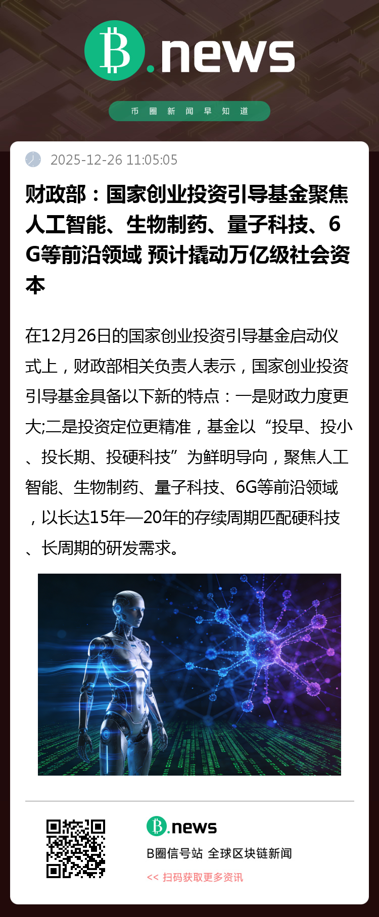 在12月26日的国家创业投资引导基金启动仪式上,财政部相关负责人表示,国家创业投资引导基金具备以下新的特点:一是财政力度更大;二是投资定位更精准,基金以“投早、投小、投长期、投硬科技”为鲜明导向,聚焦人工智能、生物制药、量子科技、6G等前沿领域,以长达15年—20年的存续周期匹配硬科技、长周期的研发需求;三是资金放大效果好。基金采取引导基金、区域基金、子基金三层架构,在区域基金及子基金层面,积极面向地方政府、金融机构、国有企业、民营企业等,通过千亿级财政资金,预计将撬动万亿级的社会资本。(来源:财联社)