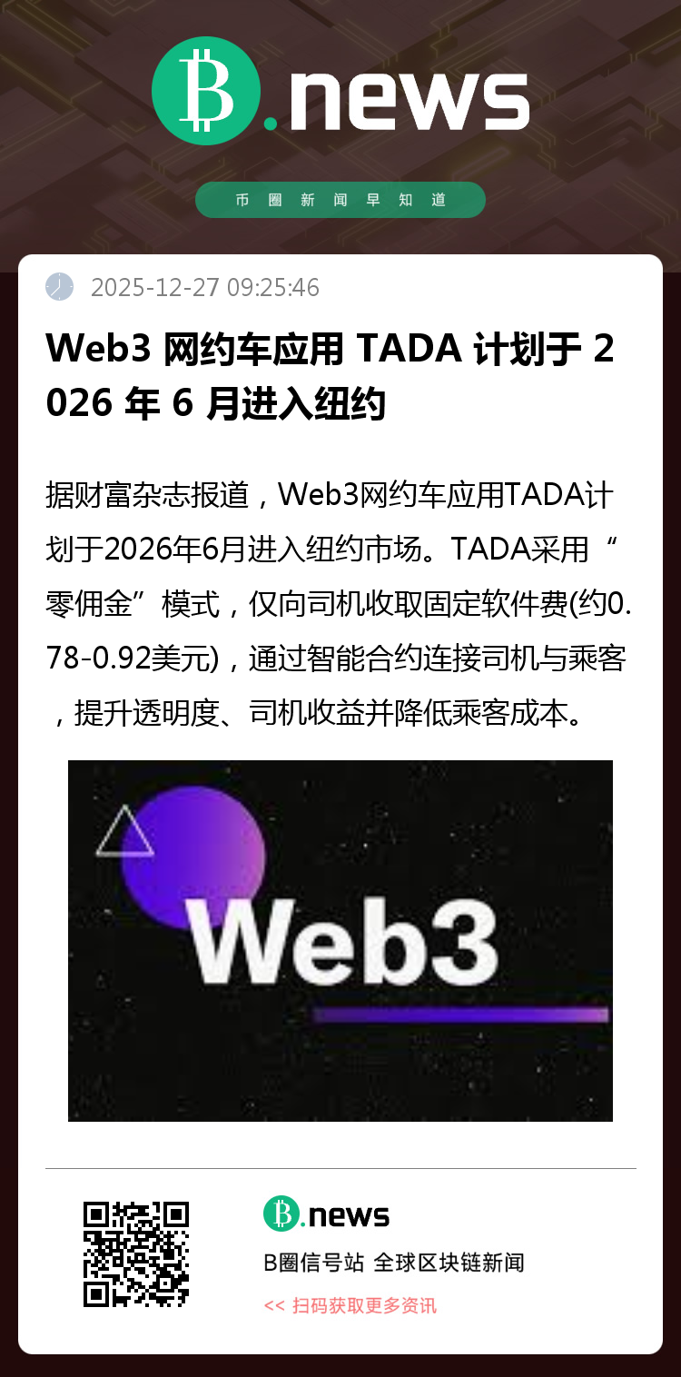 据《财富》杂志报道,基于Web3技术的网约车平台TADA计划于2026年6月正式进军纽约市场。该公司采用独特的“零佣金”运营模式,不向司机抽取行程费用,仅收取每笔约0.78至0.92美元的固定软件服务费。借助区块链智能合约,TADA直接连接司机与乘客,旨在提升交易透明度、增加司机收入,同时降低乘客出行成本。