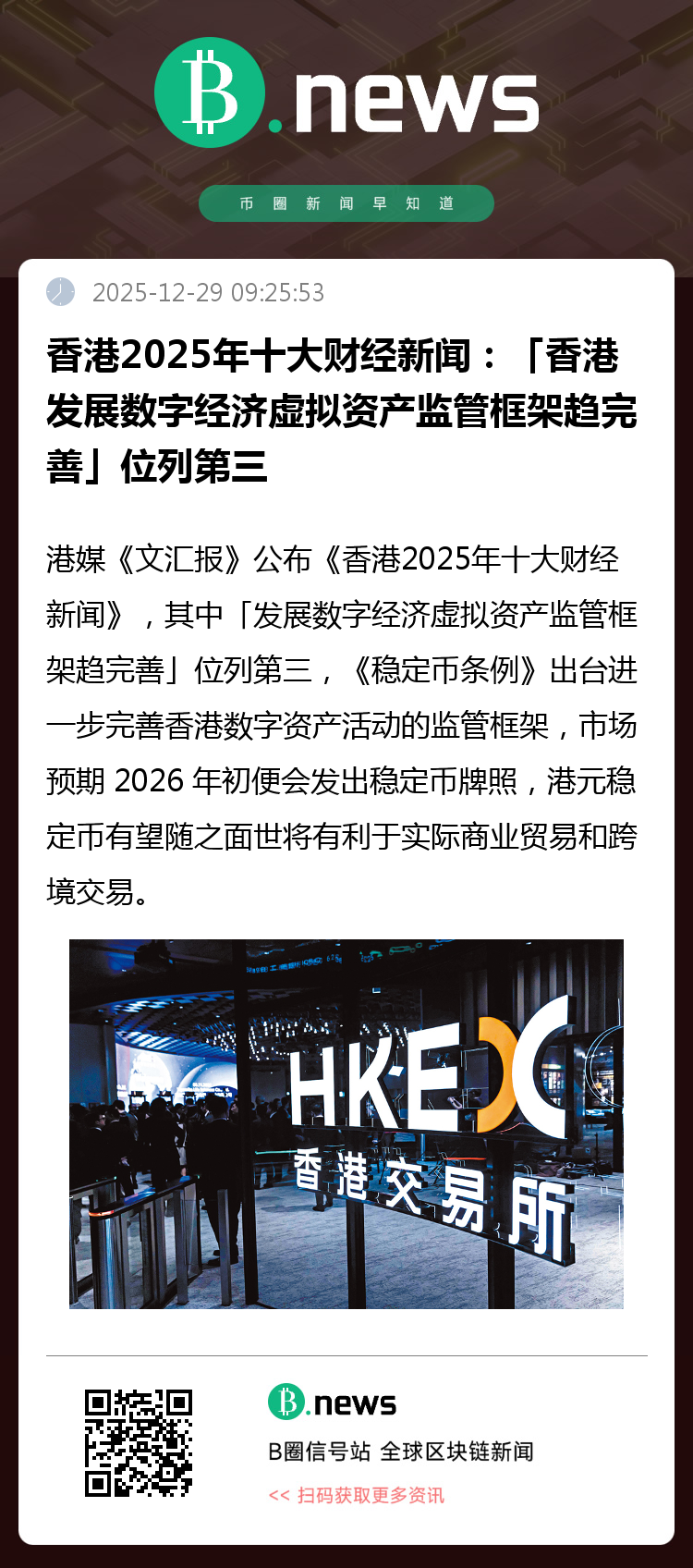 港媒《文汇报》日前发布《香港2025年十大财经新闻》,其中“发展数字经济,虚拟资产监管框架趋完善”位列第三,突显香港在数字金融领域的政策进展。报道指出,随着《稳定币条例》正式出台,香港进一步建立起涵盖发行、交易及托管等多环节的数字资产监管体系,为市场提供了明确合规指引。市场普遍预期,首批稳定币牌照将于2026年初发放,届时港元稳定币有望正式推出。这一进展被认为将大幅提升香港在数字金融领域的竞争力,不仅有助于推动本地商业贸易的数字化转型,也可为跨境支付与结算提供高效、低成本的工具,进一步巩固香港作为国际金融中心的地位。