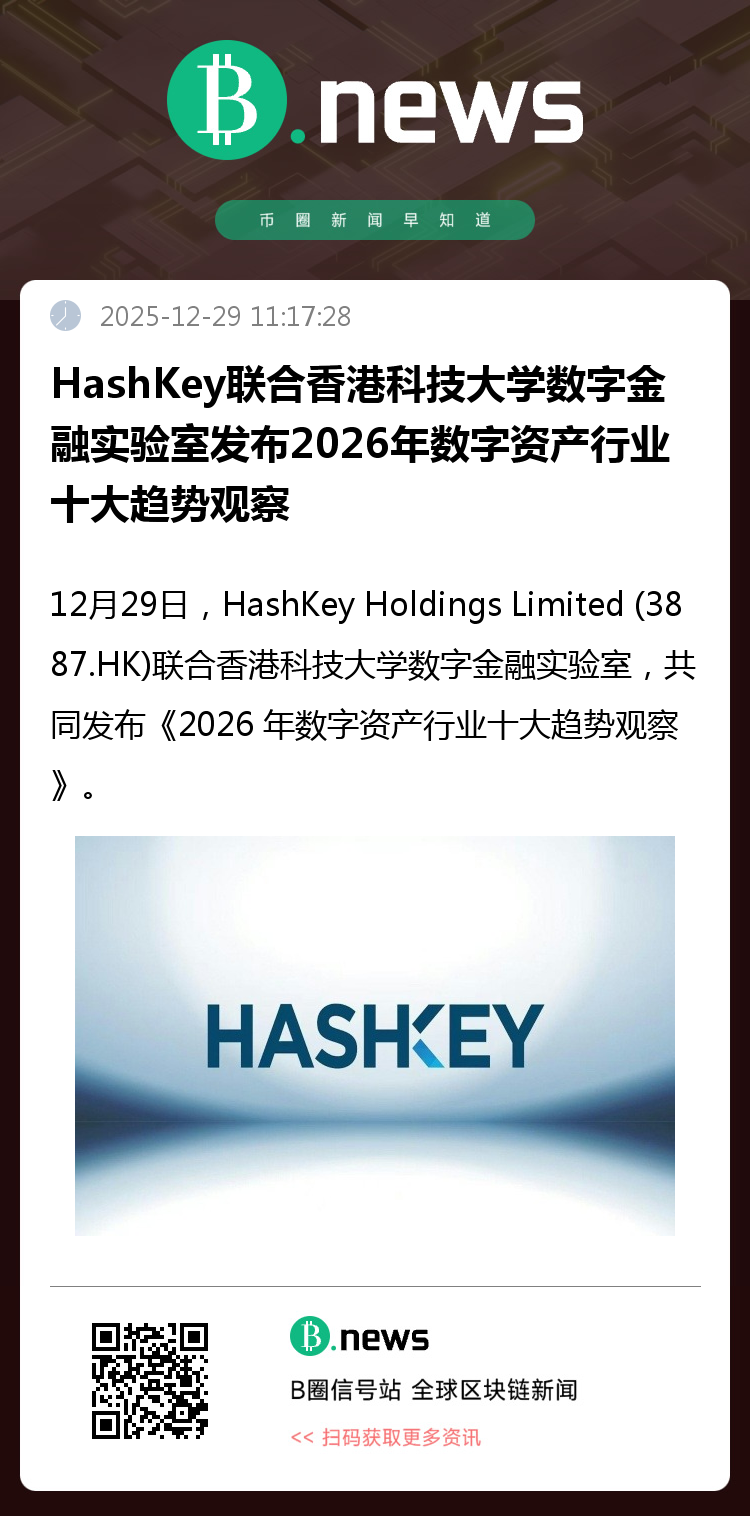 12月29日,HashKey Holdings Limited (3887.HK)联合香港科技大学数字金融实验室,共同发布《2026 年数字资产行业十大趋势观察》。行业参与者对 2026 年高度关注的十大趋势方向包括: