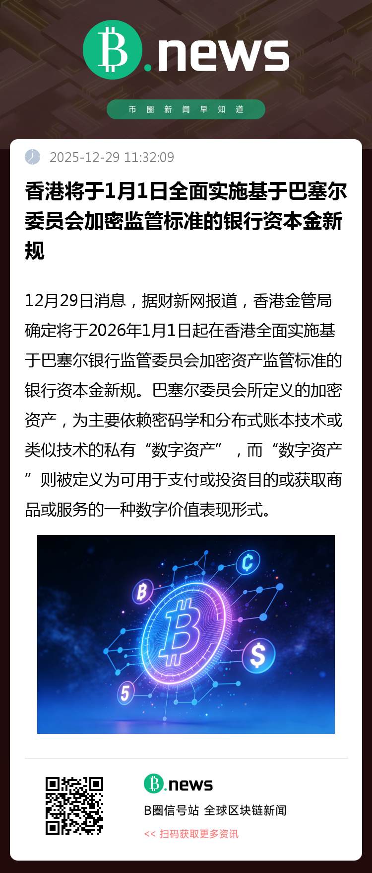 12月29日消息,据财新网报道,香港金管局确定将于2026年1月1日起在香港全面实施基于巴塞尔银行监管委员会加密资产监管标准的银行资本金新规。巴塞尔委员会所定义的加密资产,为主要依赖密码学和分布式账本技术或类似技术的私有“数字资产”,而“数字资产”则被定义为可用于支付或投资目的或获取商品或服务的一种数字价值表现形式。不仅比特币、以太坊等属于巴塞尔委员会定义中的加密资产,RWA、稳定币等也包括在内。(来源:财新网)